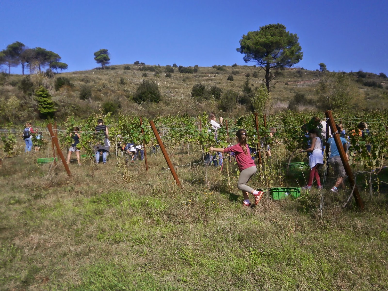 Després d'unes boniques cançons de benvinguda, que van regalar-nos i d'esmorzar, van collir raïm de la varietat Picapoll, i van carregar-lo al remolc del tractor.